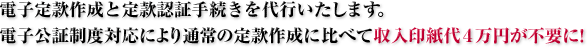 手続代行の報酬がかかることになりますが、電子定款作成認証代行の専門家である司法書士・行政書士が手続きを行い印紙税4万円が不要になるので、株式会社設立手続きをご自分自身で行う場合でも、定款部分については電子定款認証サービスをご利用頂くことで、ご自身で定款認証を行う場合に比べて設立費用のコストダウンが可能となります。